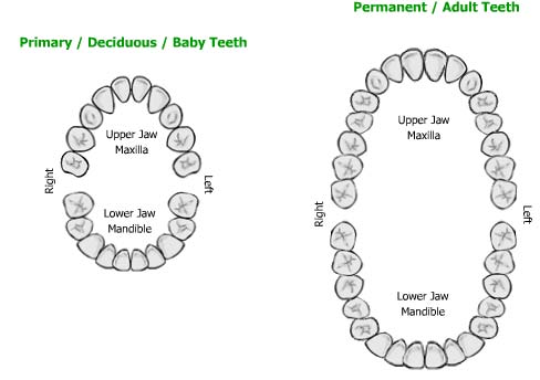 Human teeth are complex structures. The hard material of the teeth are composed of calcium, phosphorus, and other mineral salts. The material in the majority of the teeth is called dentine. The hard, shiny layer that people brush is called the enamel. The first set of teeth consists of twenty teeth: there are ten teeth in each jaw. The primary teeth begin to appear when an infant reaches the age of six months. They continue to emerge until the child is approximately two years old. The first permanent tooth usually erupts at the age of six, and a mixture of primary and permanent teeth coexist until the child reaches about twelve years old. By the age of twelve, most children possess 28 of the 32 permanent teeth. The average timetable varies among individuals, but this time variation is not important. The sequence of when each kind of tooth emerges is more important than the age at which this occurs. In fact, deviations in the order of sequence of types of teeth often indicate the possibility of future
